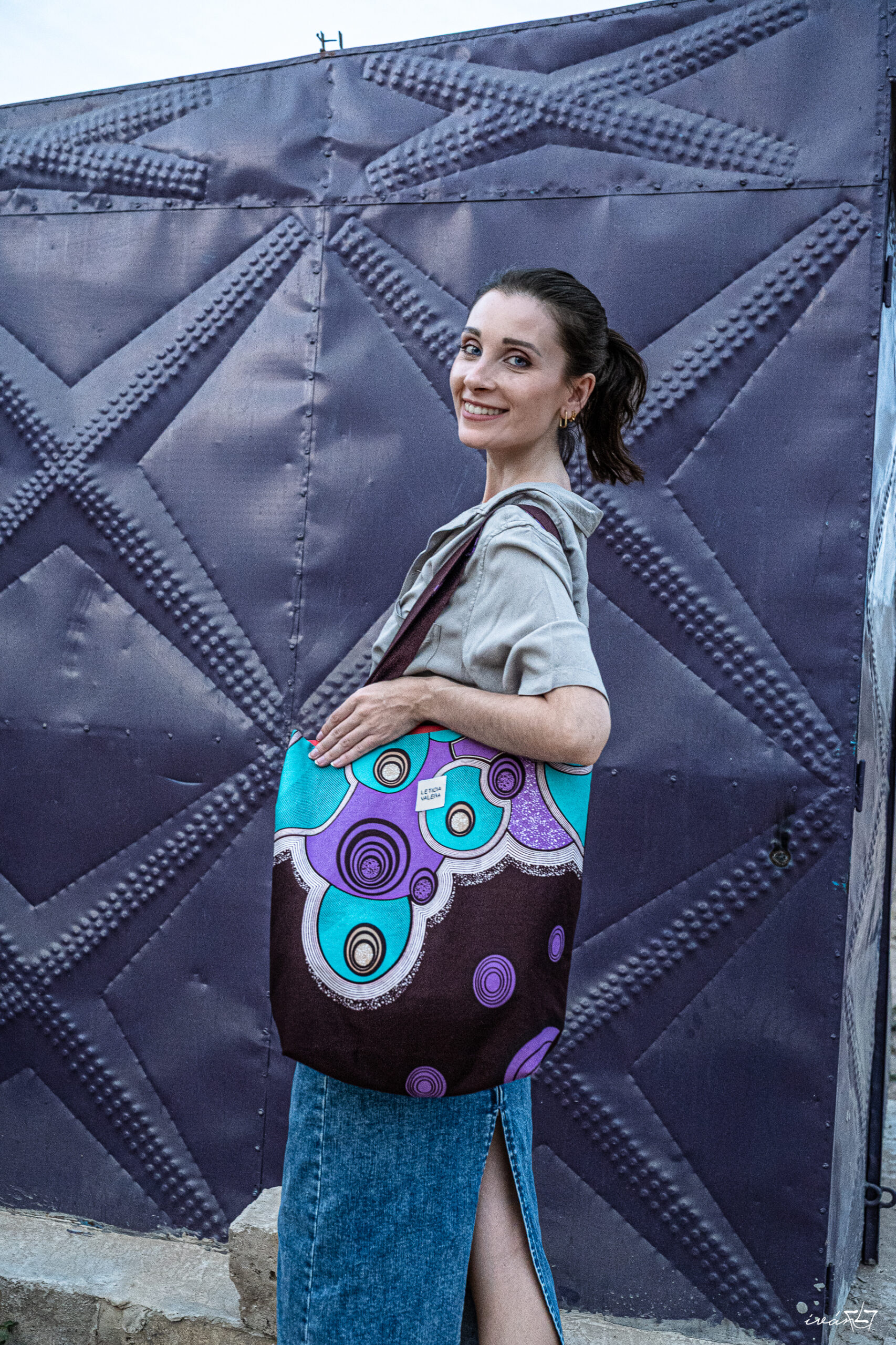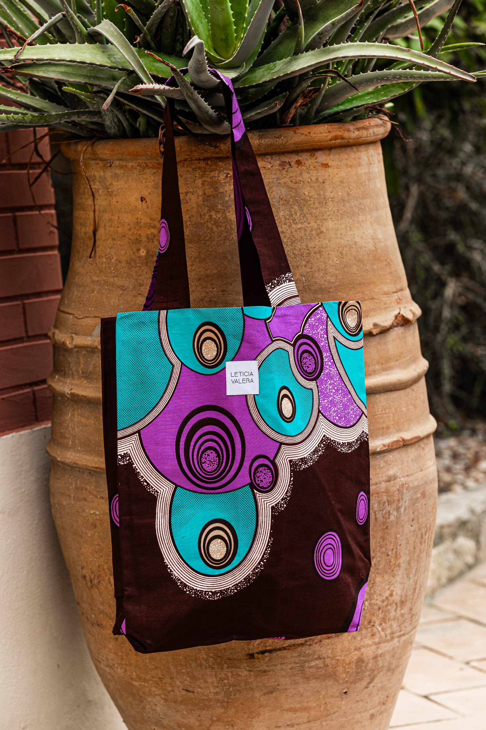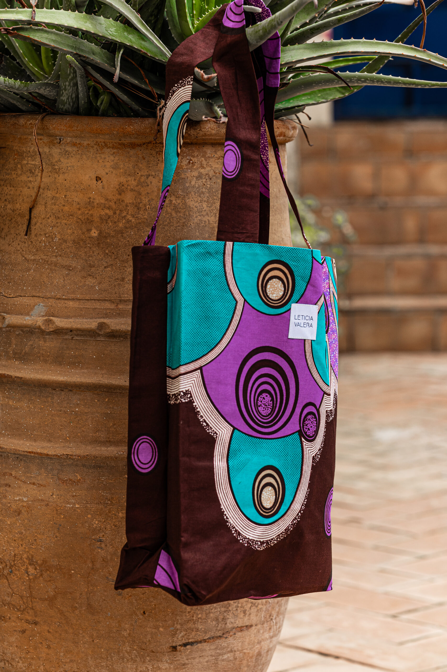 Descubre el Tote Bag Bassari, un bolso artesanal hecho a mano por comunidades africanas, elaborado con tejidos tradicionales auténticos. Cada pieza es única, combinando tonos morado, negro y azul celeste para aportar frescura, estilo original y personalidad a tu look diario.
